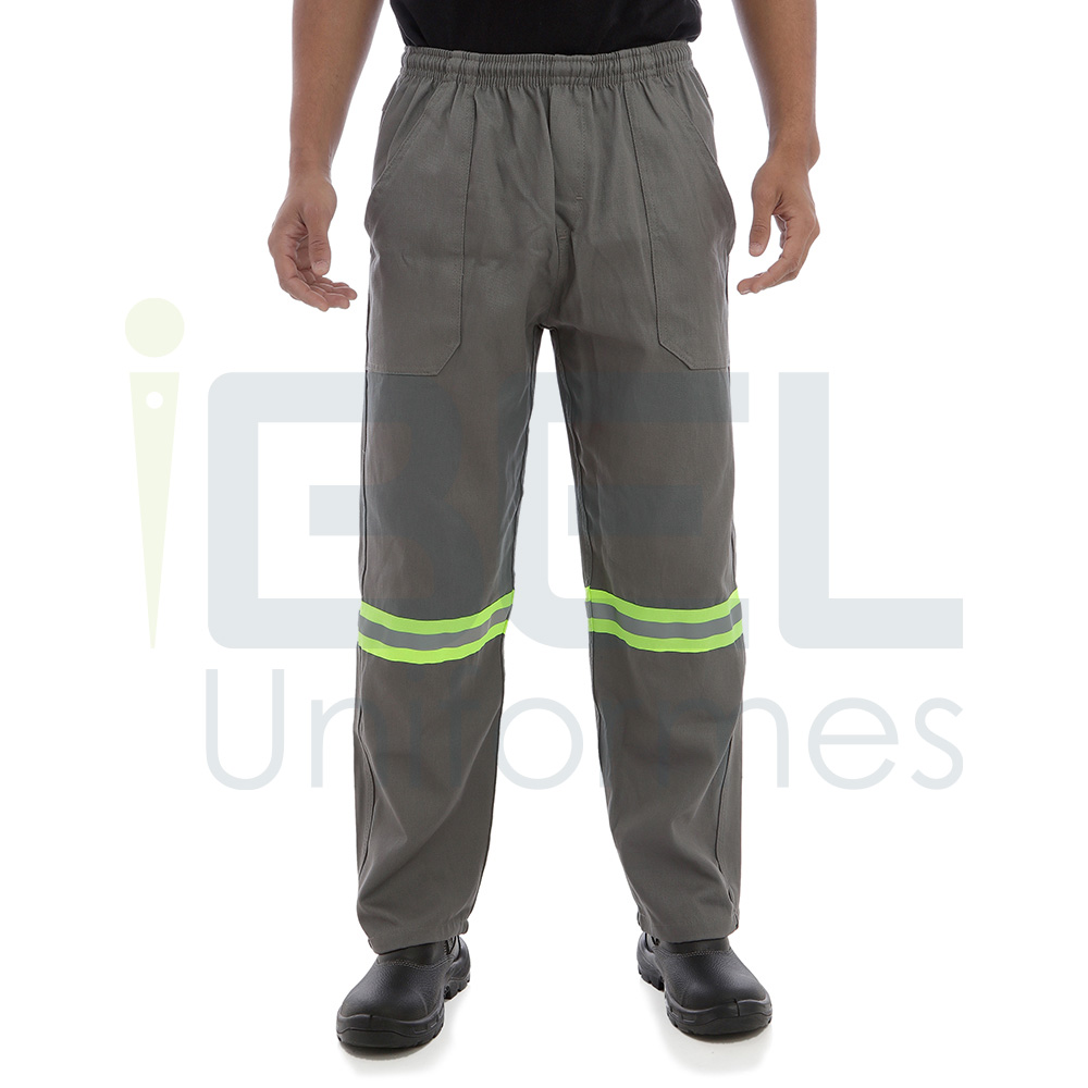 CALÇA CINTURA ELÁSTICO TOTAL, BRIM PROFISSIONAL PESADO, 100% ALGODÃO, 4 BOLSOS, COM FAIXAS REFLETIVAS 5 CM VERDE COM PRATA.